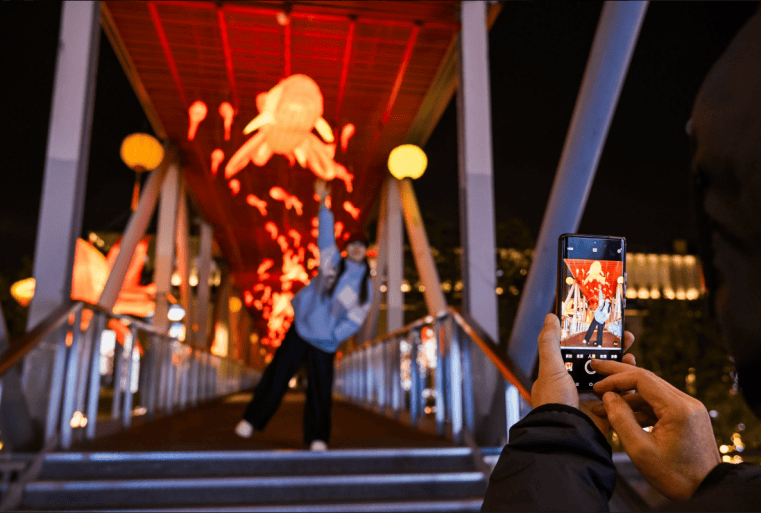 龙湖虹桥天街——天街庙会·非遗风物年货大集热闹开市,11米高鎏光花火树、2000平千灯祈愿长街、800平“回家”创意大画,成为新春打卡热门地。春节期间(2月15日—23日)免费停车6小时,即日起至2月24日,来沪返沪旅客凭当日虹桥机场或火车站票根,可至B2会员中心领取专属珑珠消费券,在光影与年味中,感受新春暖意。